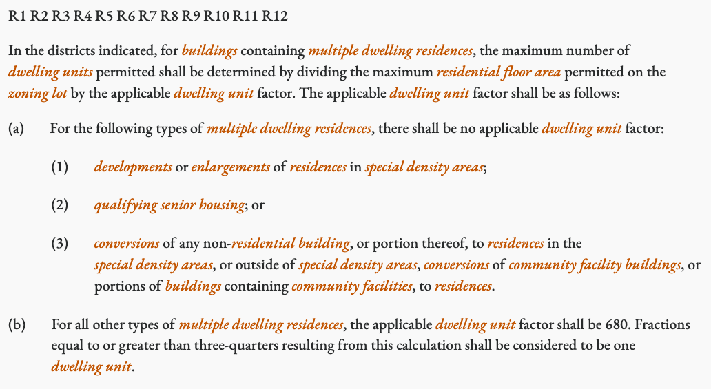 As part of City of Yes, we changed the Dwelling Unit Factor (DUF), which tells us how many units we can fit into buildings. Previously, the rules were roughly: In dense areas, you must have a per-unit average of 680 square ft, and in other areas, you have a more restrictive limit, often requiring an averqage of above 1,000 sqft per apartment.